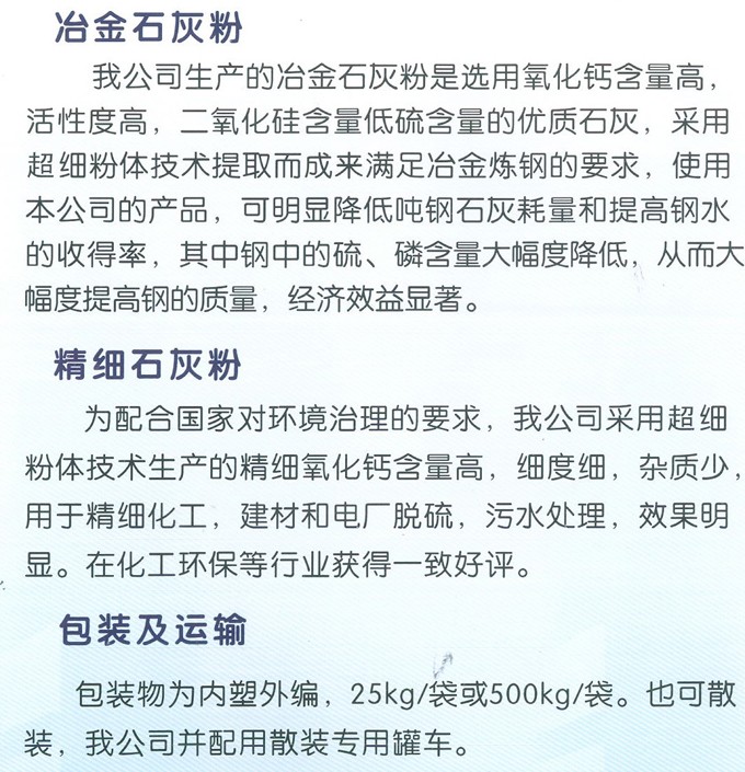 生產(chǎn)的氫氧化鈣、氧化鈣、重質(zhì)碳酸鈣、灰鈣粉,主要用于電力行業(yè)脫硫、污水處理、冶金、皮革、涂料、造紙化工等行業(yè)